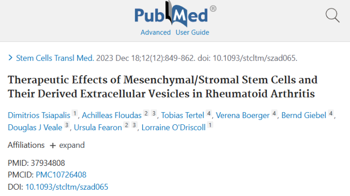 近年来,多项研究进一步验证了MSCs应用RA的潜力。2023年11月,发表于《干细胞转化医学》的一项研究评估了人间充质干细胞及其来源的细胞外囊泡对RA患者CD4 + T细胞的影响。结果显示,MSCs及其囊泡均能有效调节免疫反应,而经干扰素 - β(IFN - β)预处理后,其抑制滑膜成纤维细胞迁移及表面标志物表达的能力进一步增强,提示基于MSCs的疗法在RA治疗中具有良好前景。